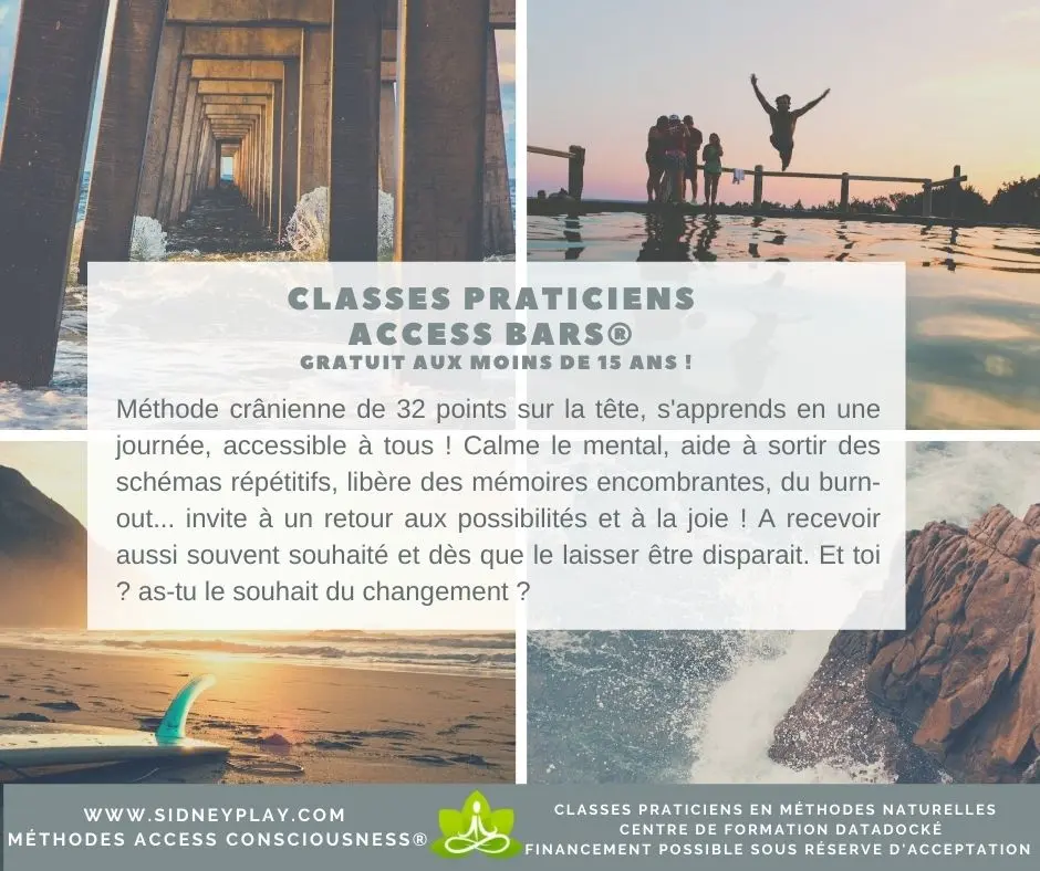 Important : Ce stage « Livre des Possibilités® » ne permet pas d’accéder directement à la classe Fondation ni de devenir Facilitateur (formateur) des Bars d’Access Consciousness®. Un stage de relaxation crânienne « Access Bars® » est indispensable pour cela.